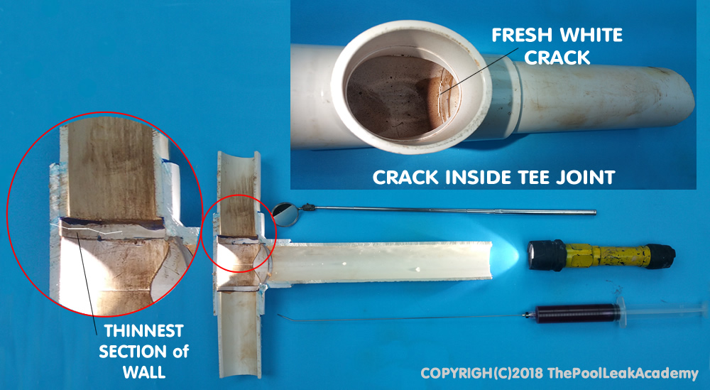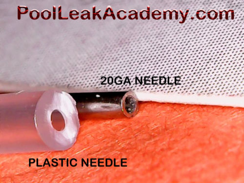 One of the biggest mistakes beginners make is using the wrong syringe when looking for a leak. Precision with the needles is the key to success because if you overlook the leak in question- your in for a long day searching the rest of the pool. I've done it a hundred times and its no fun. If your dye testing with a reagent bottle from chemical test kit you might find one or two leaks but your luck will run out. If you really want a false sense of security; use the plastic needle supplied with the "blue dye" syringes. Your success rate will be 70%- which means your failure rate is 30%. Still to high.